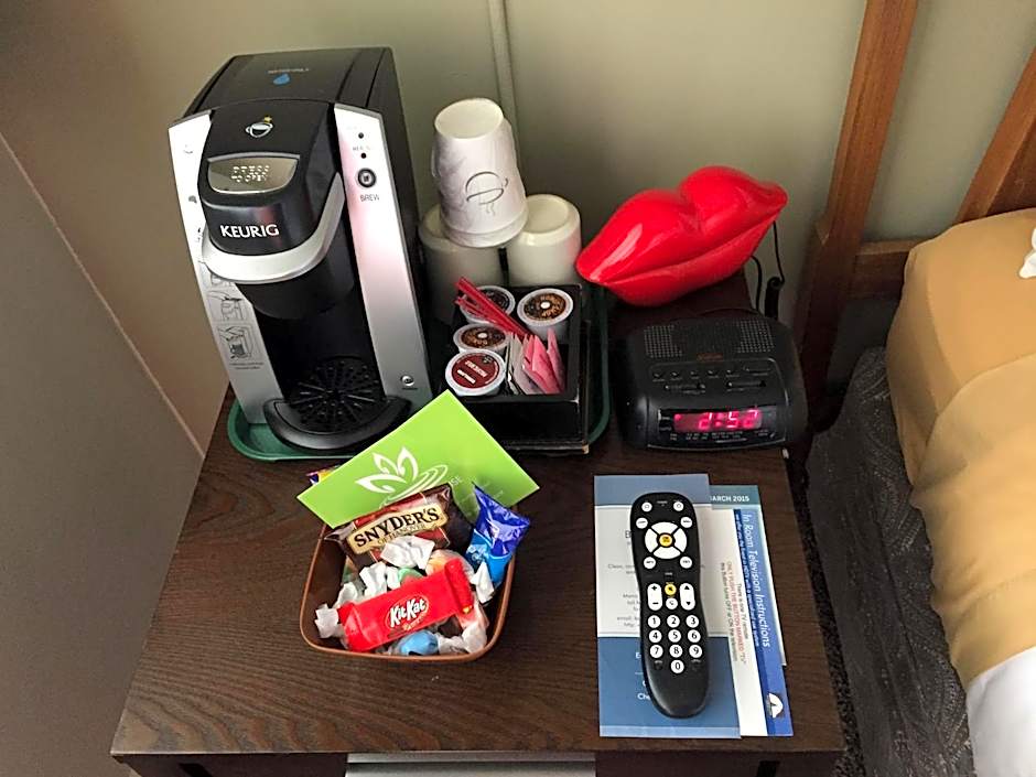 This ground floor room offers a view of the patio. There is a small refrigerator, single-use coffee maker and hairdryer. A bathroom with a shower is provided. Bottled water, taffy and freshly baked daily cinnamon buns are provided. Iron is offered upon request. Please note a ceiling fan and window fan are offered. There is no air conditioning.